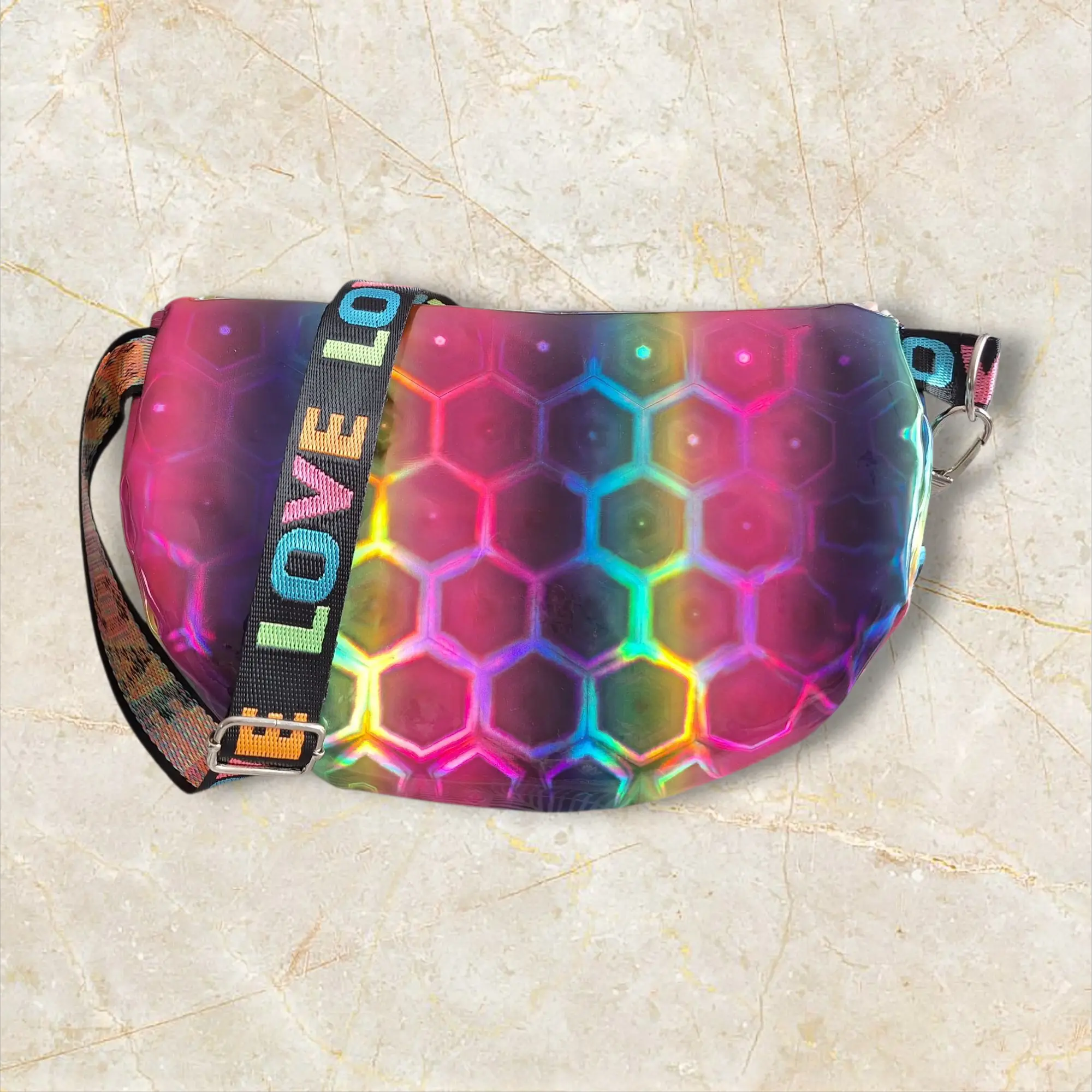 Une banane de confection artisanale en Bretagne, en tissu brillant irisé Multicolore. Idéale pour les amateurs de couleurs vives !