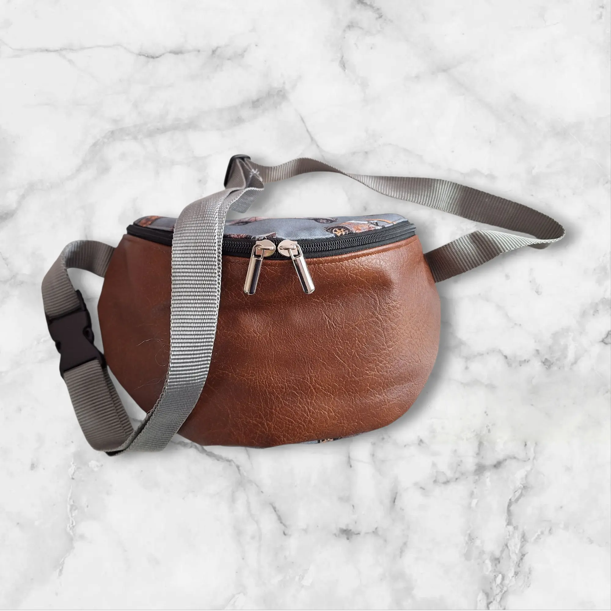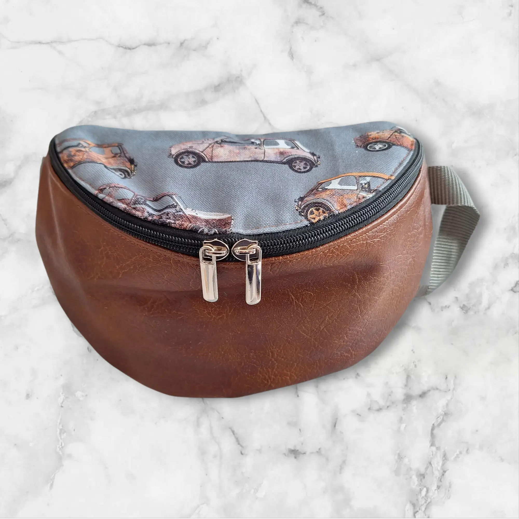 Une banane en simili-cuir couleur camel et tissu motifs voitures anciennes. Idéal pour les amateurs de voiture !