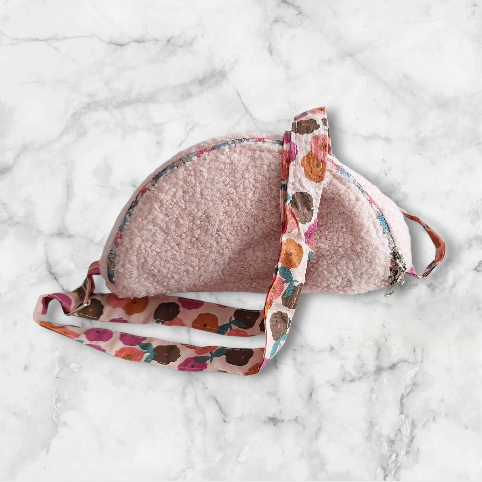 Une banane de confection artisanale en Bretagne, en tissu rose effet mouton et bandoulière fleurie. Idéale pour les envies de cocooning !