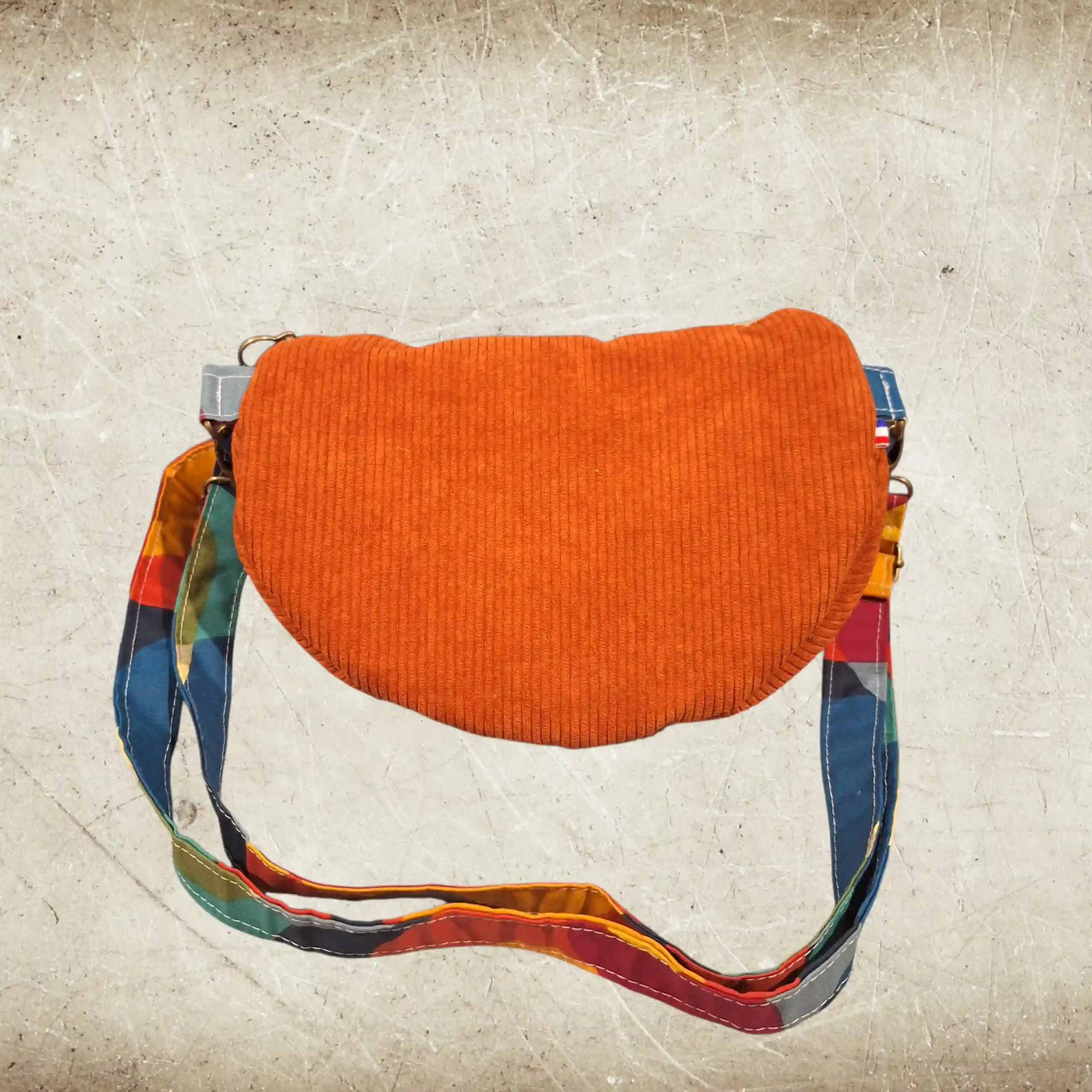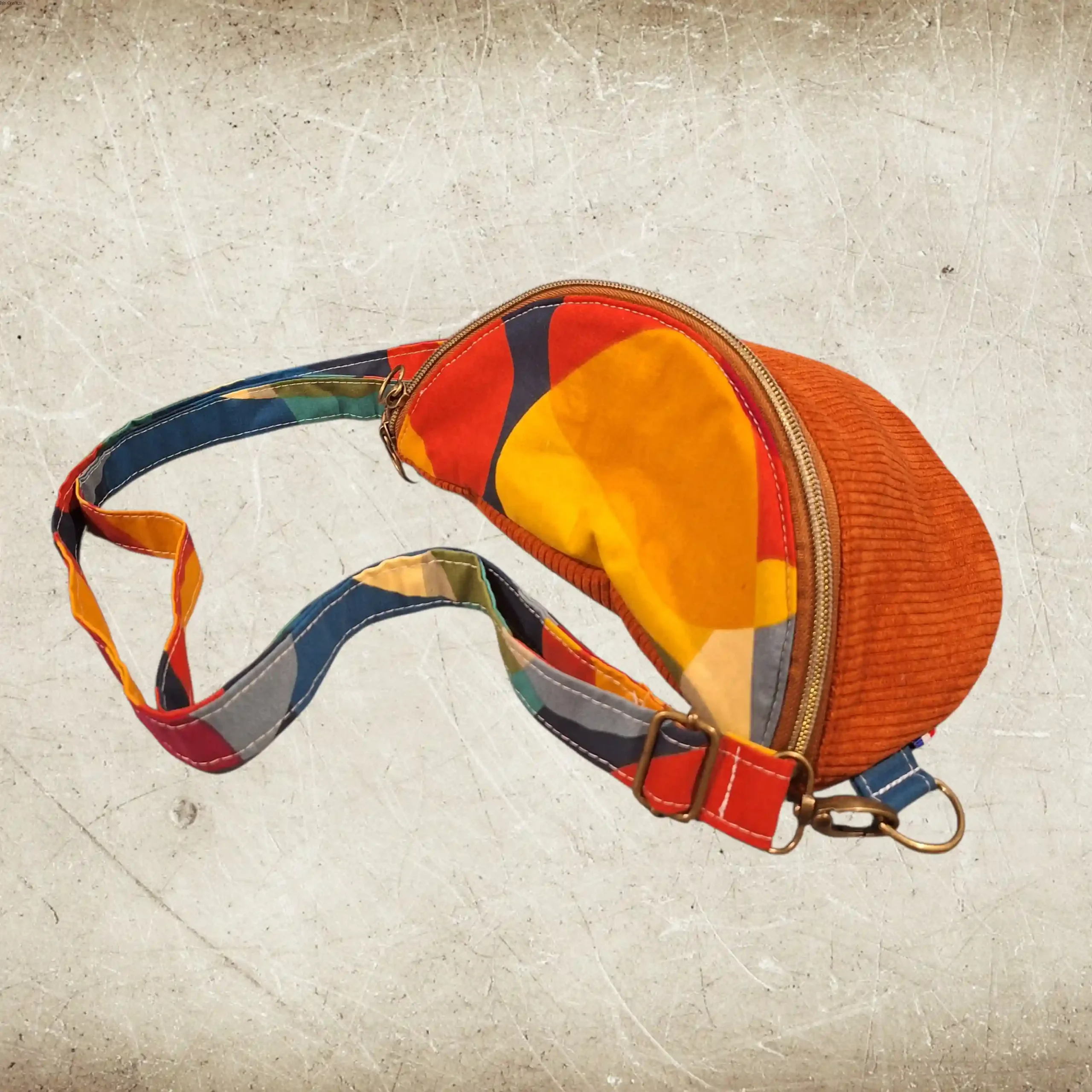 Chaleureuse et lumineuse, cette banane en velours côtelé orange apporte une touche solaire à toutes les tenues. Associée au tissu coloré graphique, elle affirme un style joyeux et audacieux.