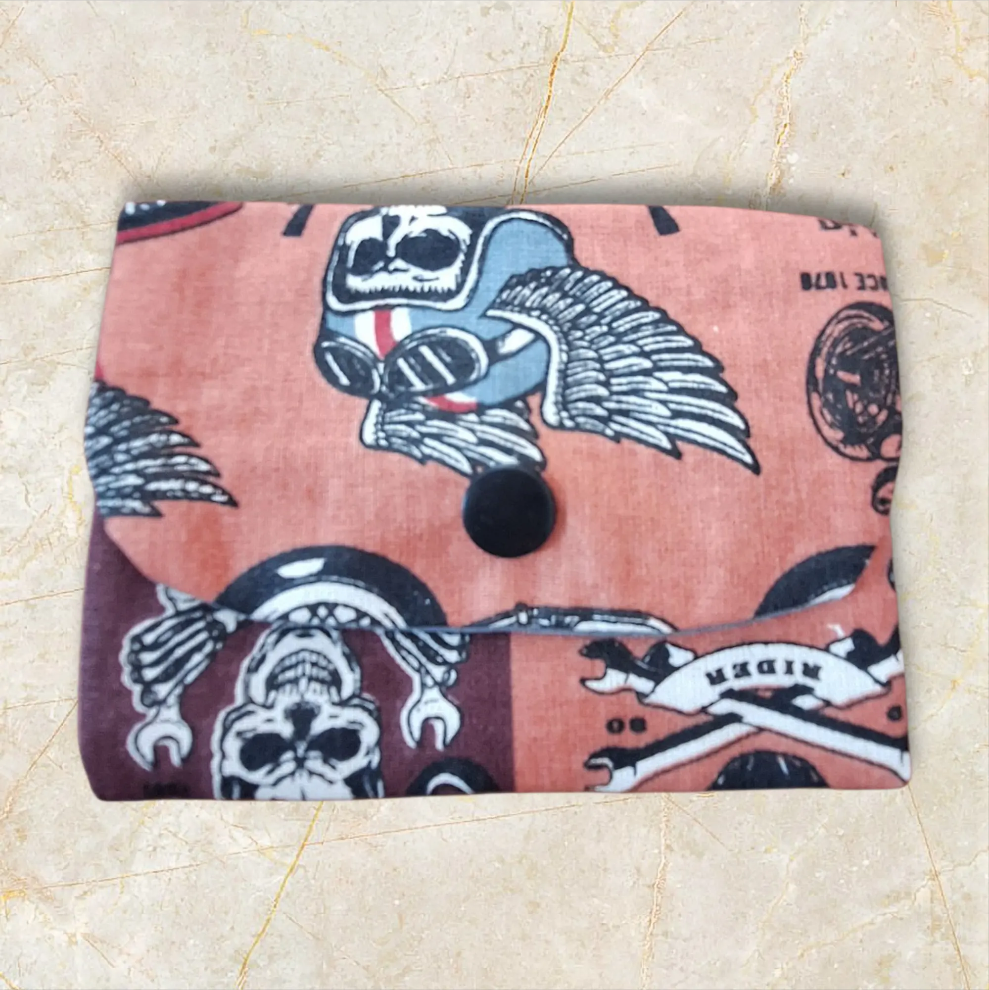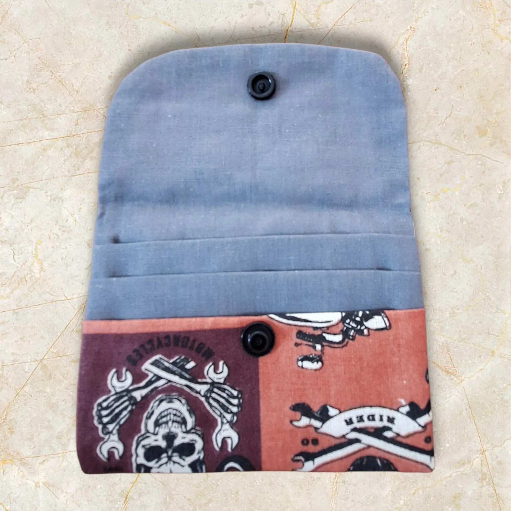 Porte-cartes en tissu artisanal, compact et unique, avec 3 encoches pouvant accueillir plusieurs cartes. Fermeture par pression, pratique et sûr.