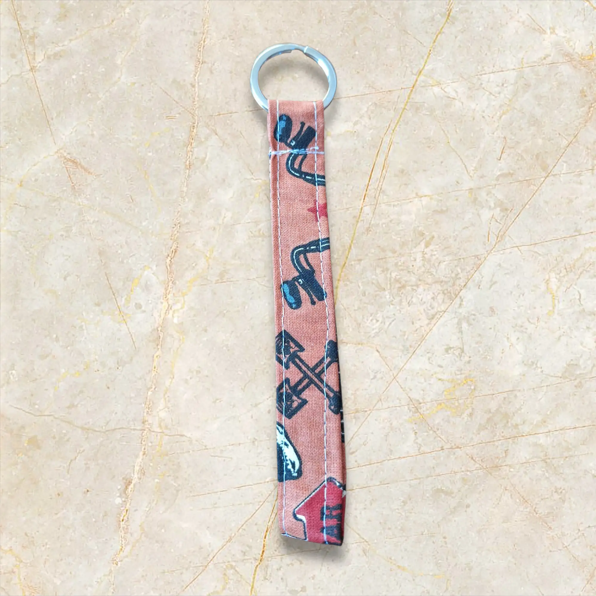 Porte-clé en tissu artisanal cousu main, rouge motifs moto. Pratique et original, il permet de repérer et attraper vos clés facilement.