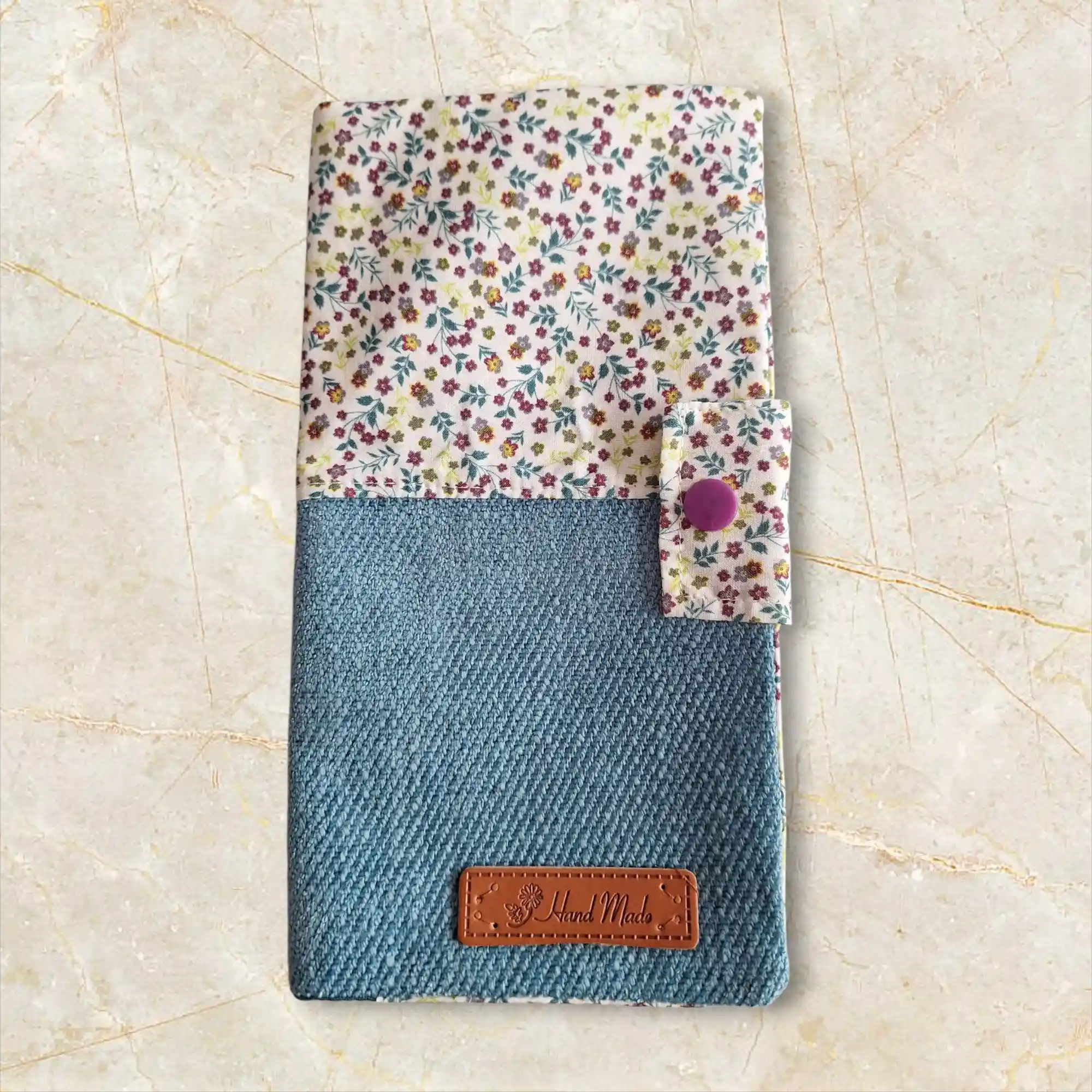 Alliez praticité et style avec ce portefeuille artisanal en tissu, conçu pour organiser vos cartes et papiers essentiels au quotidien. Confectionné avec soin, il associe un tissu jean robuste à un tissu blanc fleuri délicat, offrant un mélange élégant et unique.