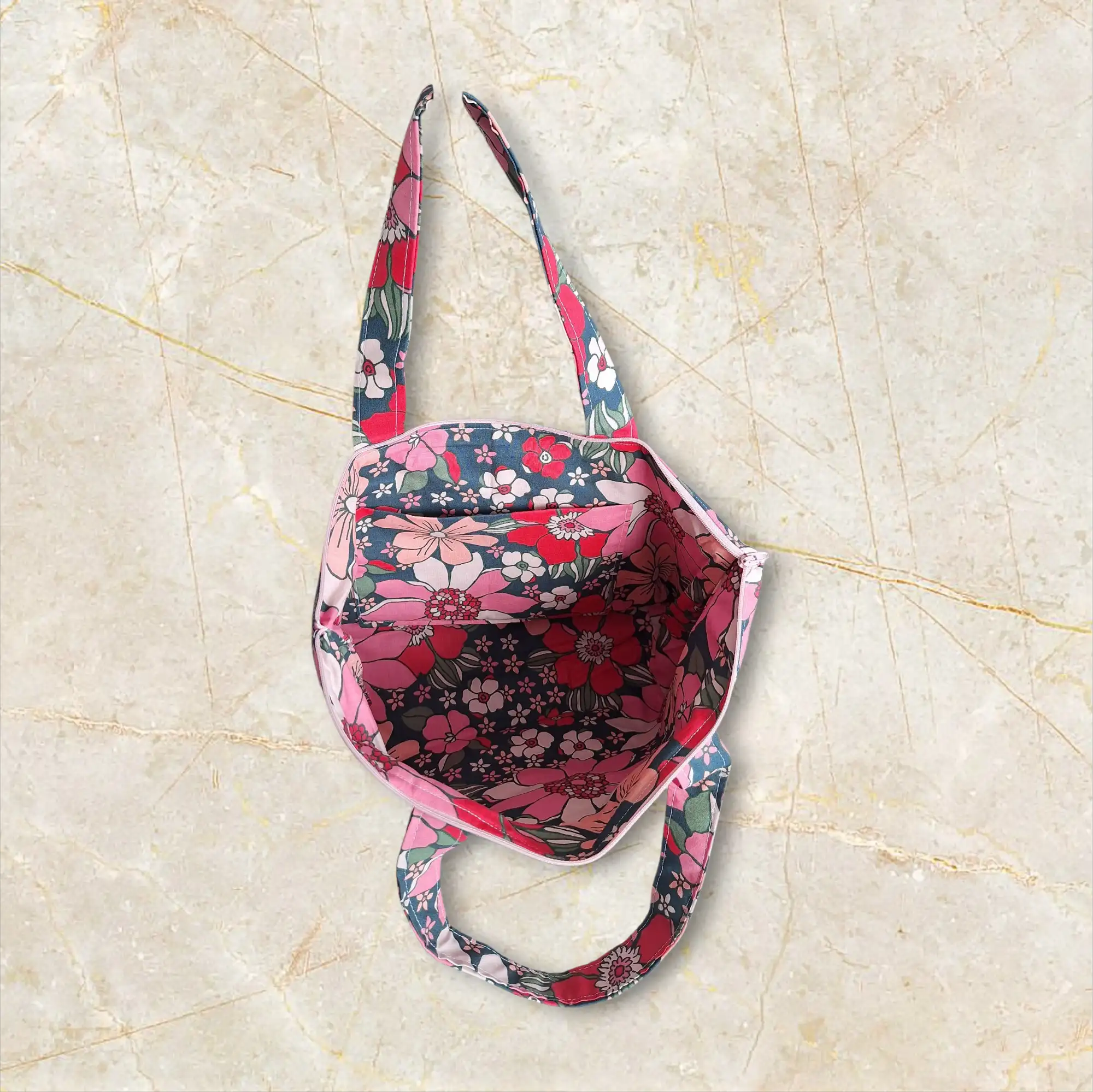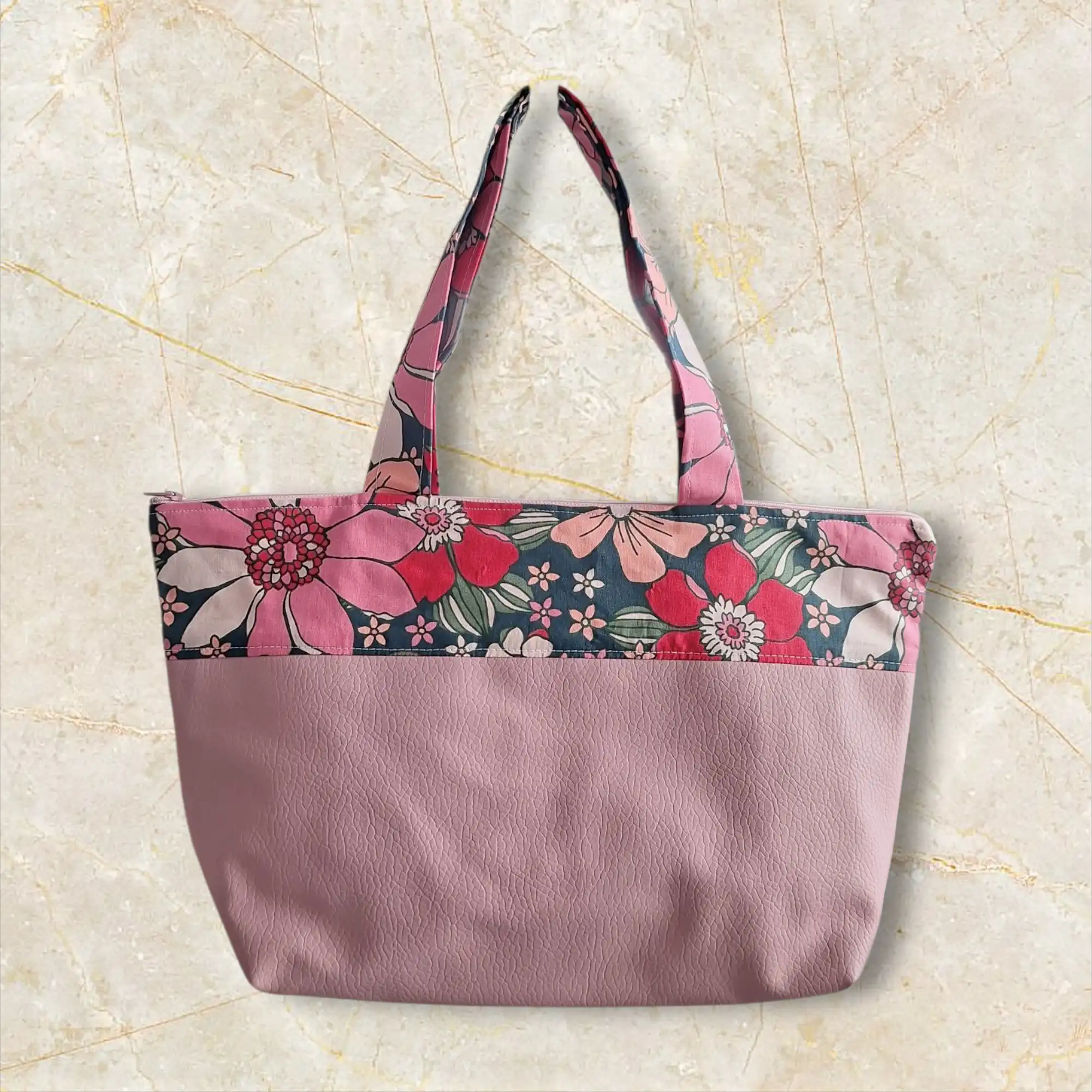 Sac cabas artisanal en simili rose et tissu fleuri, spacieux et pratique, avec fermeture éclair et poche intérieure pour vos essentiels.!
