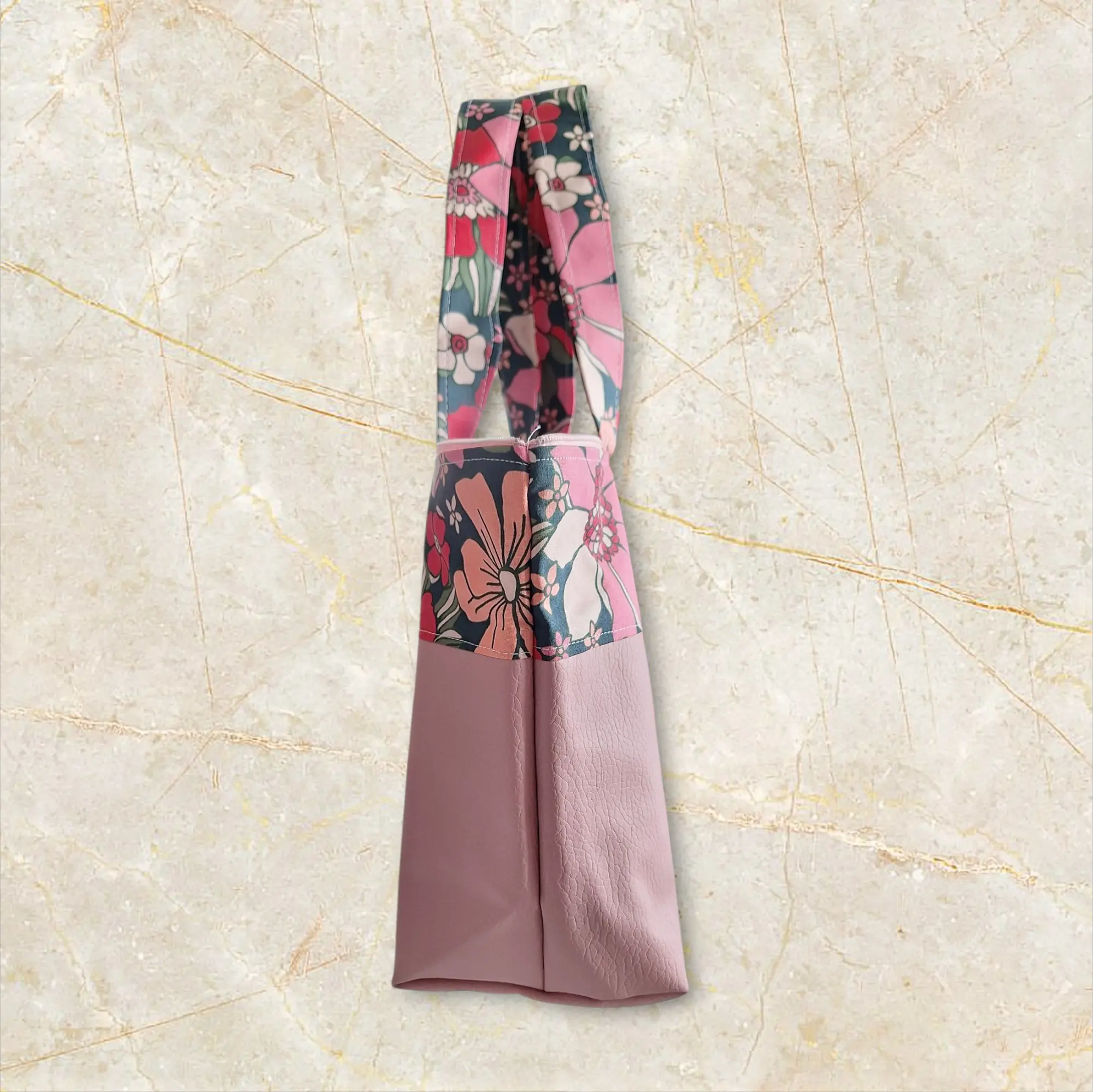 Le design combine élégamment les deux tiers inférieurs en simili rose et le tiers supérieur ainsi que l’intérieur en tissu fleuri, pour un contraste subtil et charmant. Les anses en tissu fleuri offrent un porté confortable et harmonieux.