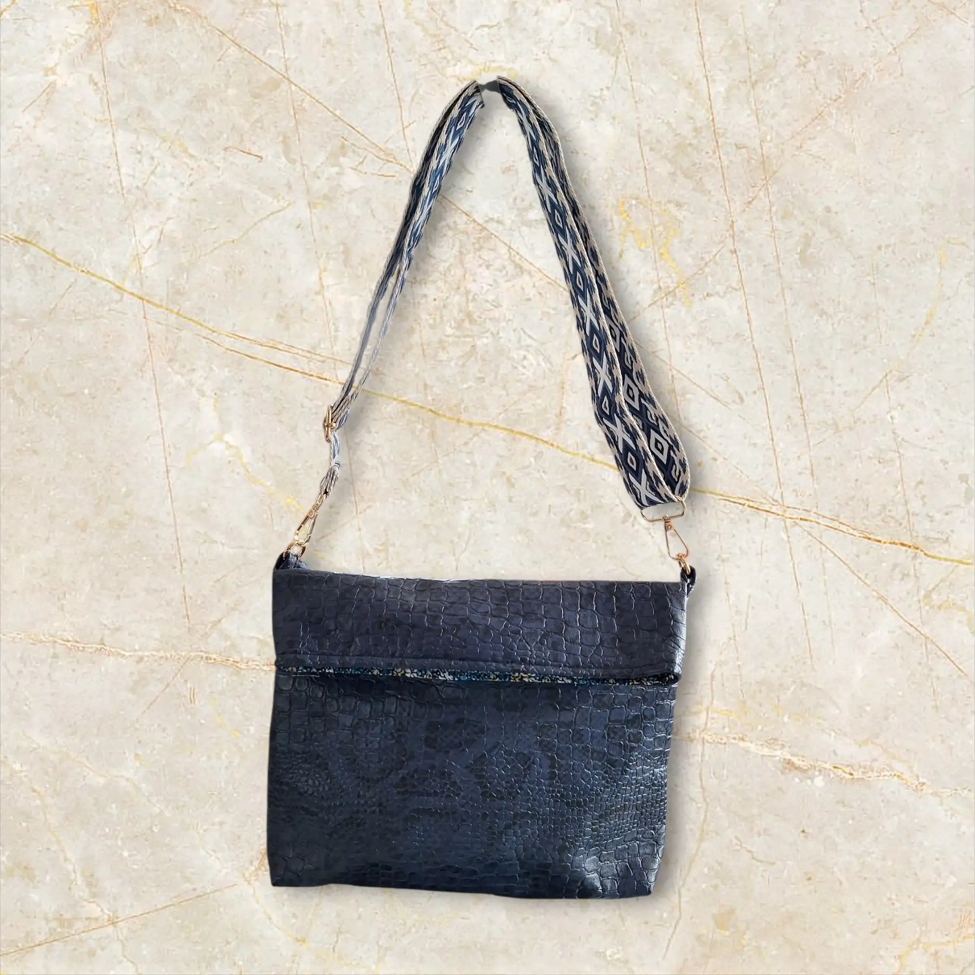Sac artisanal en simili cuir effet crocodile bleu, intérieur fleuri, poche pratique et bandoulière réglable à motifs losanges.