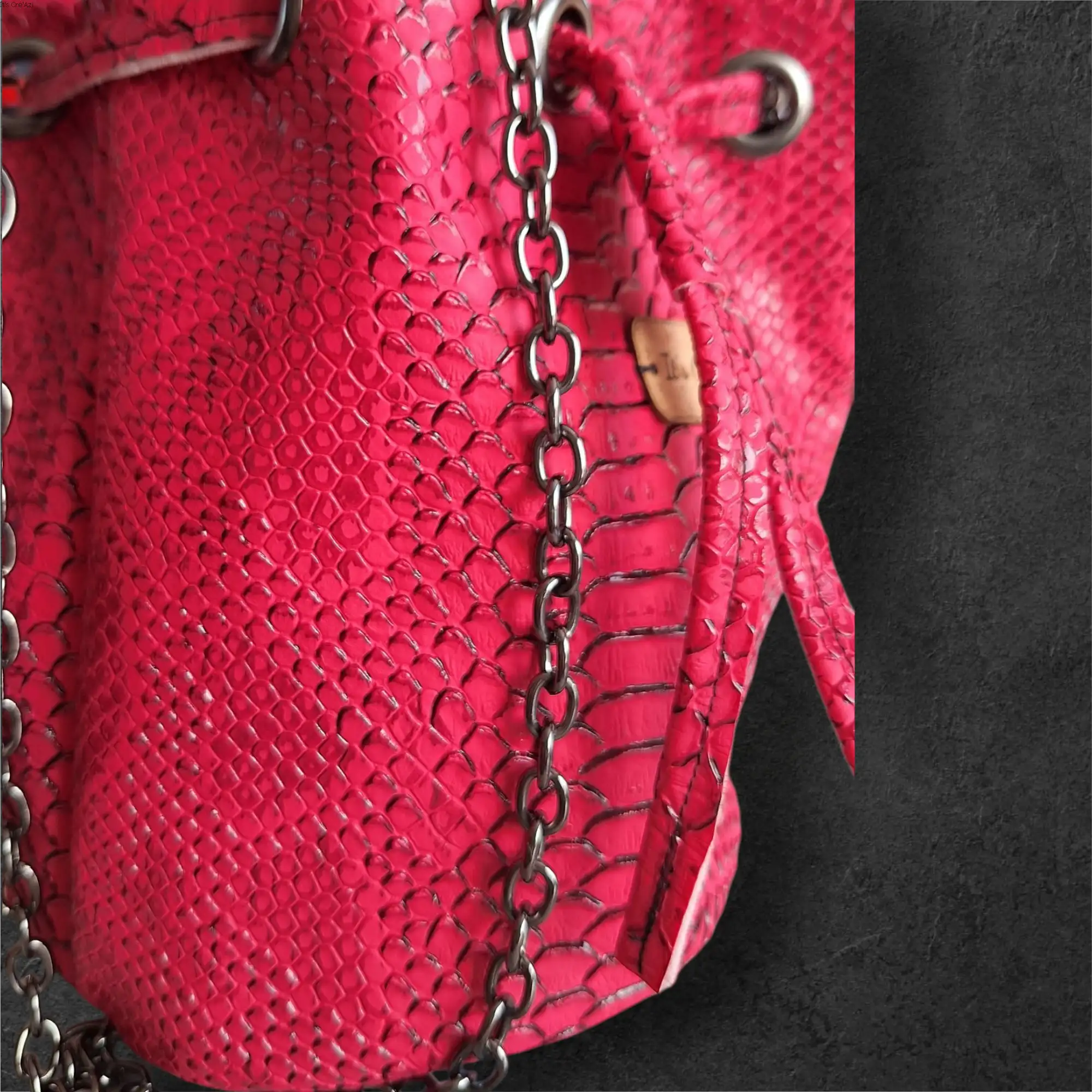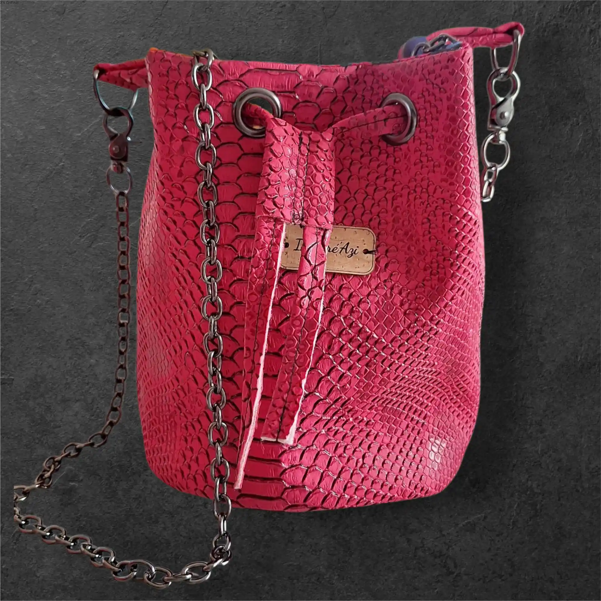 Confectionnés à la main en simili cuir Komodo à effet croco, ils allient style et praticité avec leur forme seau à base ronde et leur joli volume intérieur.