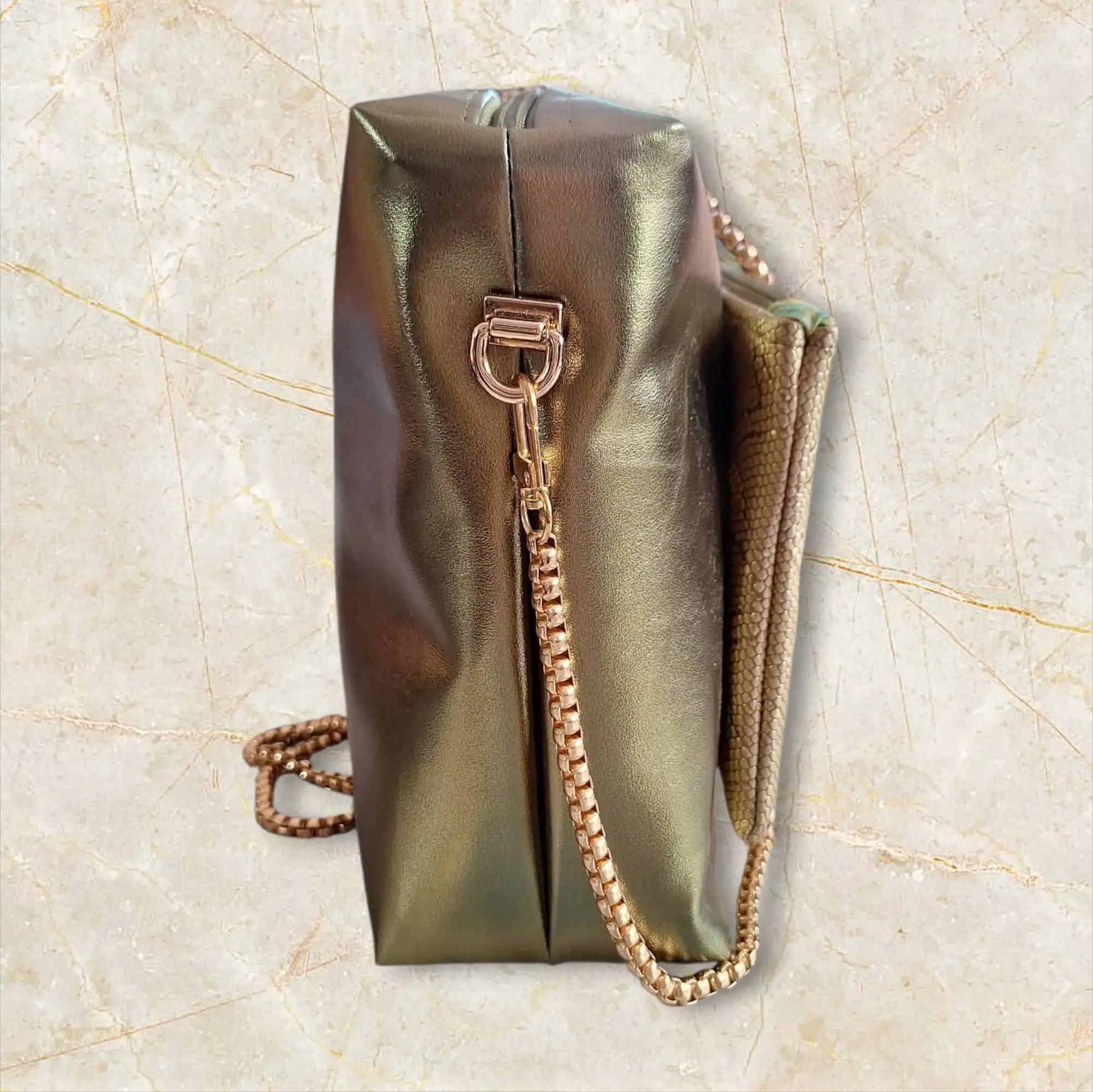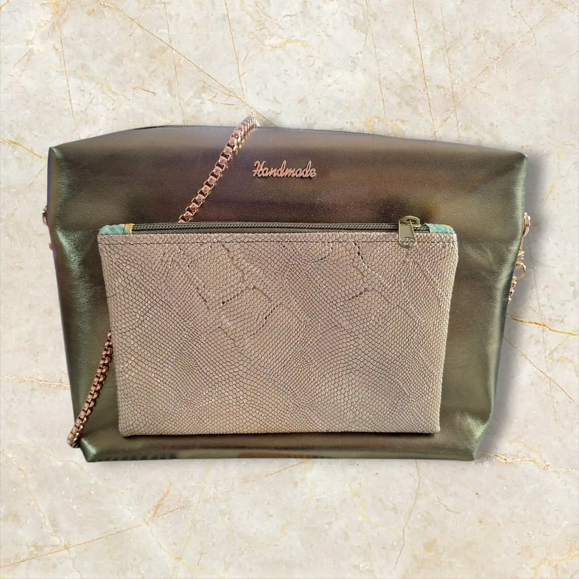 Sac à main artisanal Valérie en simili cuir vert irisé, poche avant simili croco doré et bandoulière métallique, chic et pratique au quotidien.