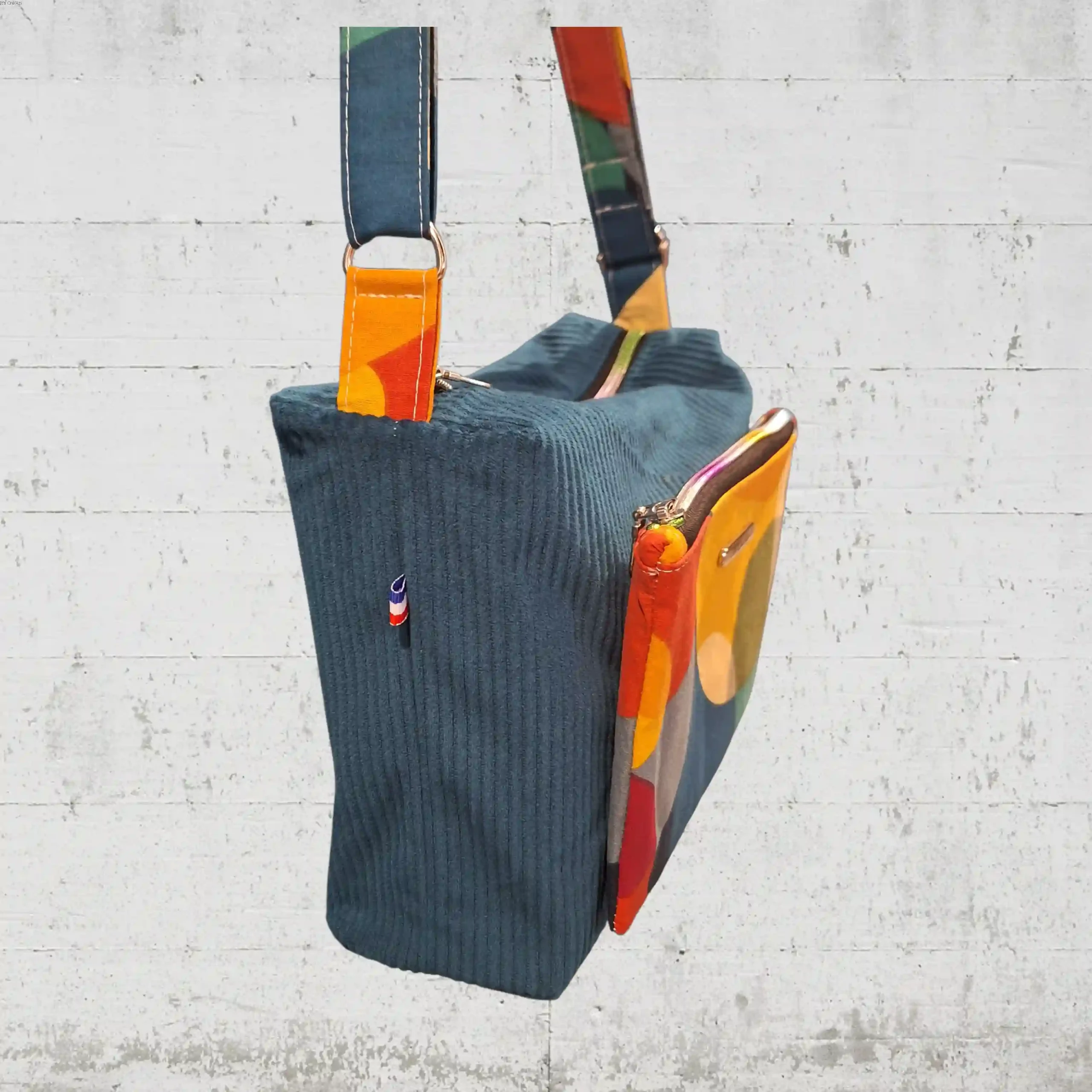 Sac bandoulière en velours côtelé bleu canard, fait main, doté d’une poche en relief graphique. Un accessoire pratique et unique pour le quotidien.Sac bandoulière en velours côtelé, à la fois pratique, original, confortable, fonctionnel et plein de style.