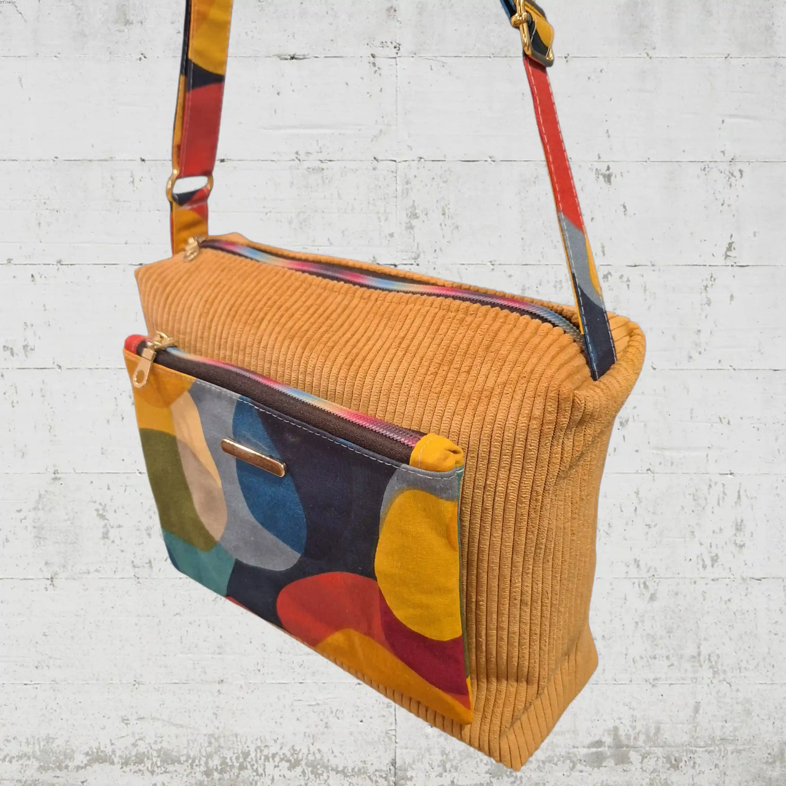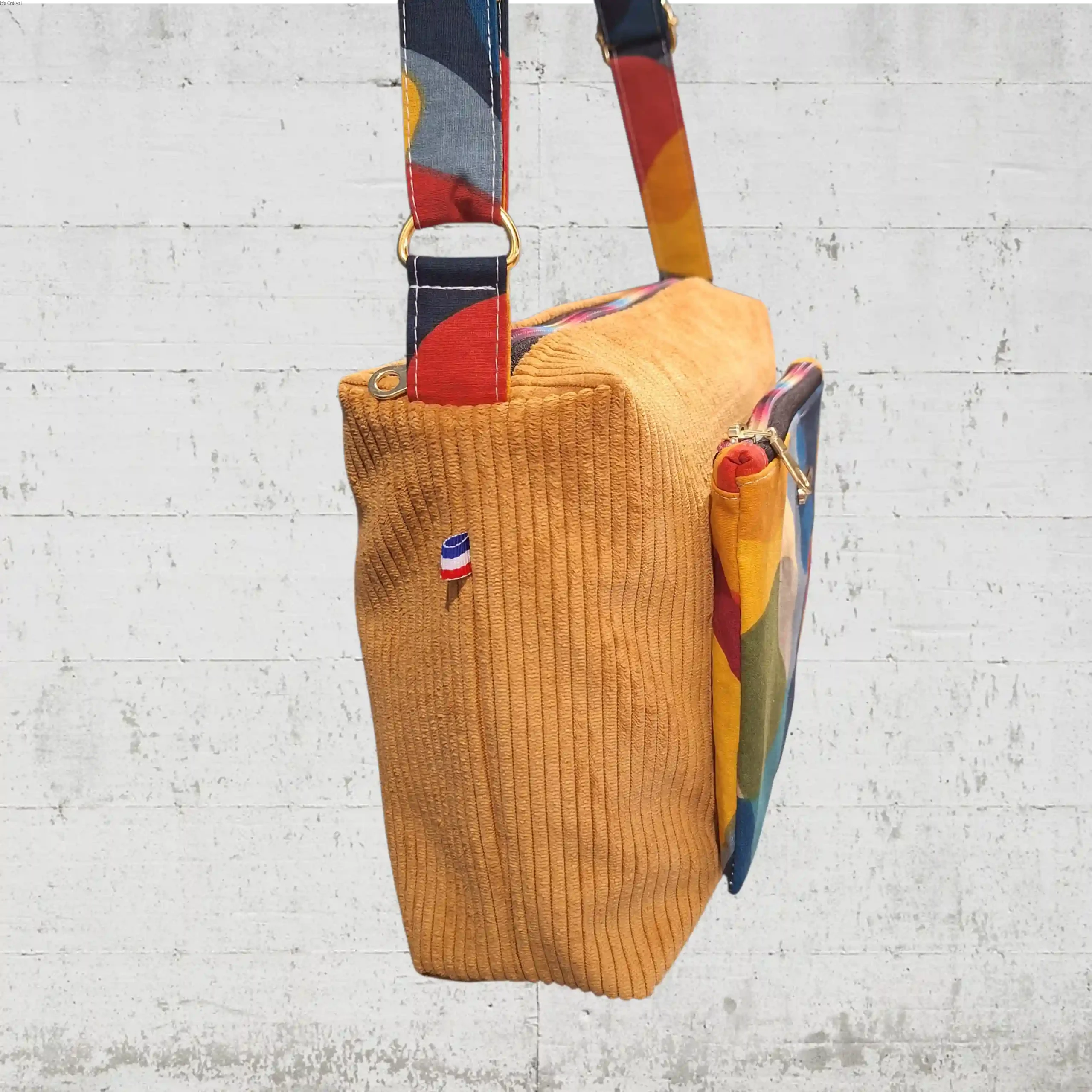 Le velours côtelé apporte une texture douce et chaleureuse, tandis que la poche extérieure en relief – véritable signature du modèle – offre une touche graphique et originale. Chaque sac est unique par ses associations de couleurs et de tissus, ce qui en fait un accessoire singulier, loin des productions standardisées.