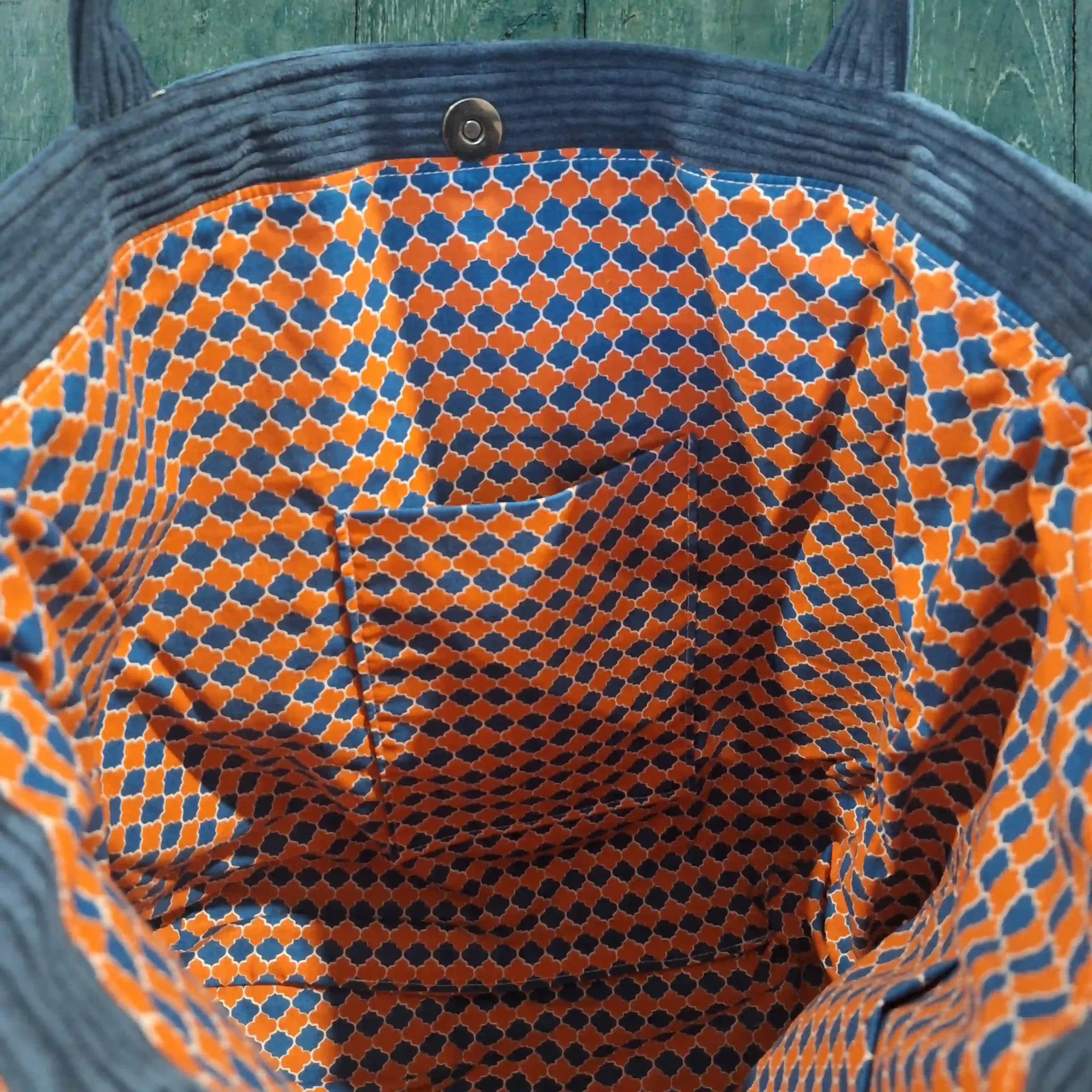 Élégant et intemporel, le cabas en velours bleu marine est rehaussé par un intérieur graphique aux motifs orange, offrant un contraste chic et original.