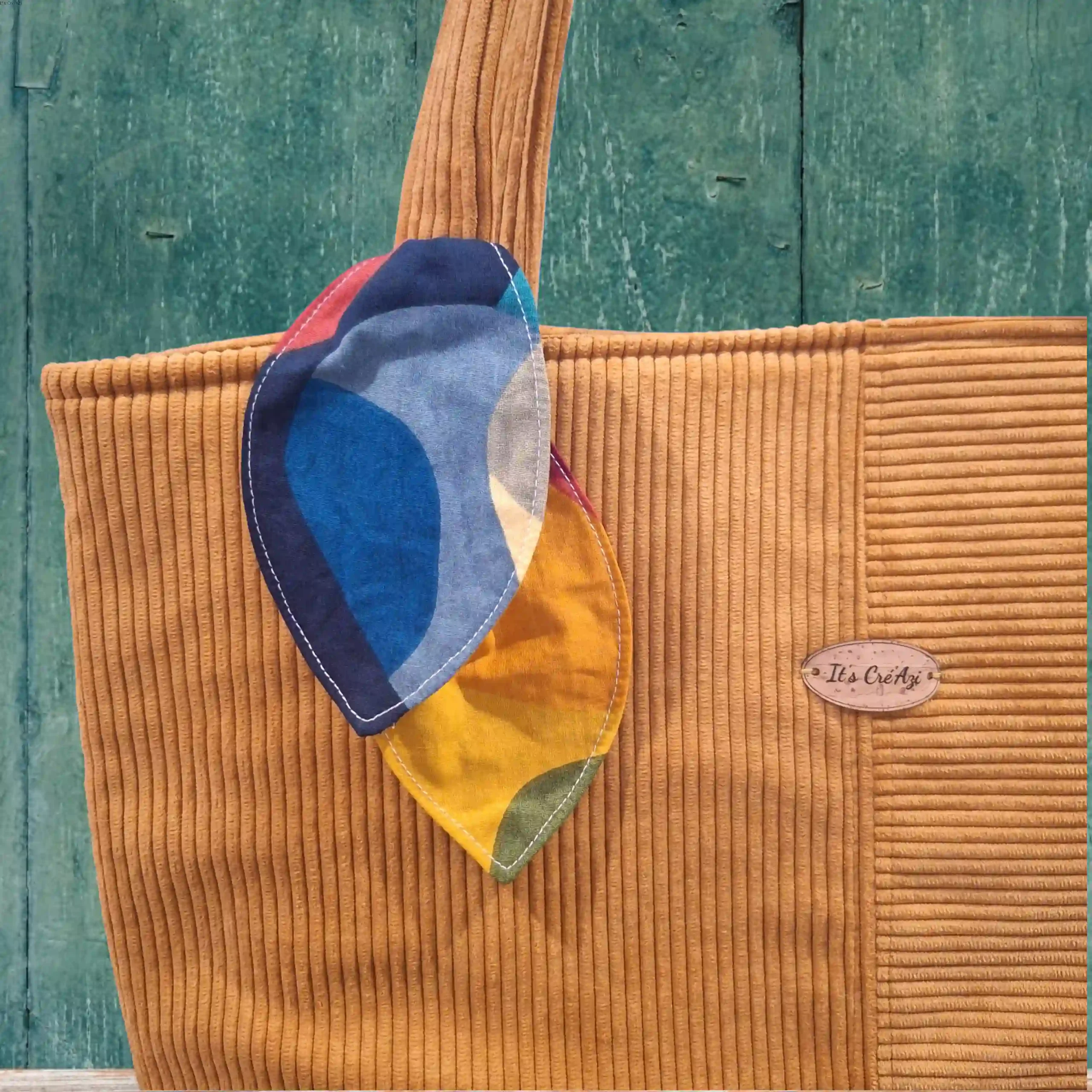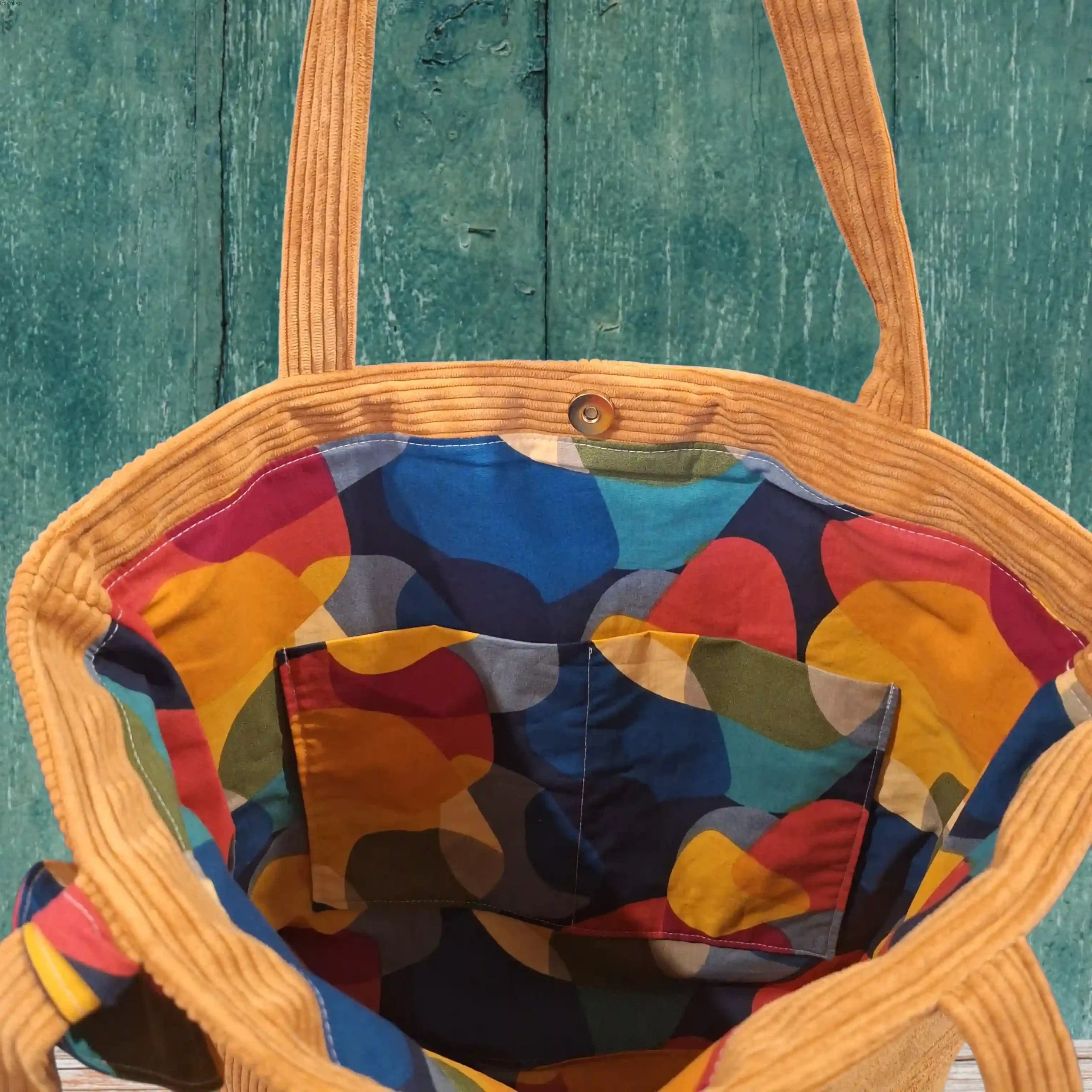 Audacieux et joyeux, le cabas en velours moutarde attire immédiatement le regard. Son tissu intérieur multicolore aux formes graphiques lui donne une personnalité unique et résolument créative.