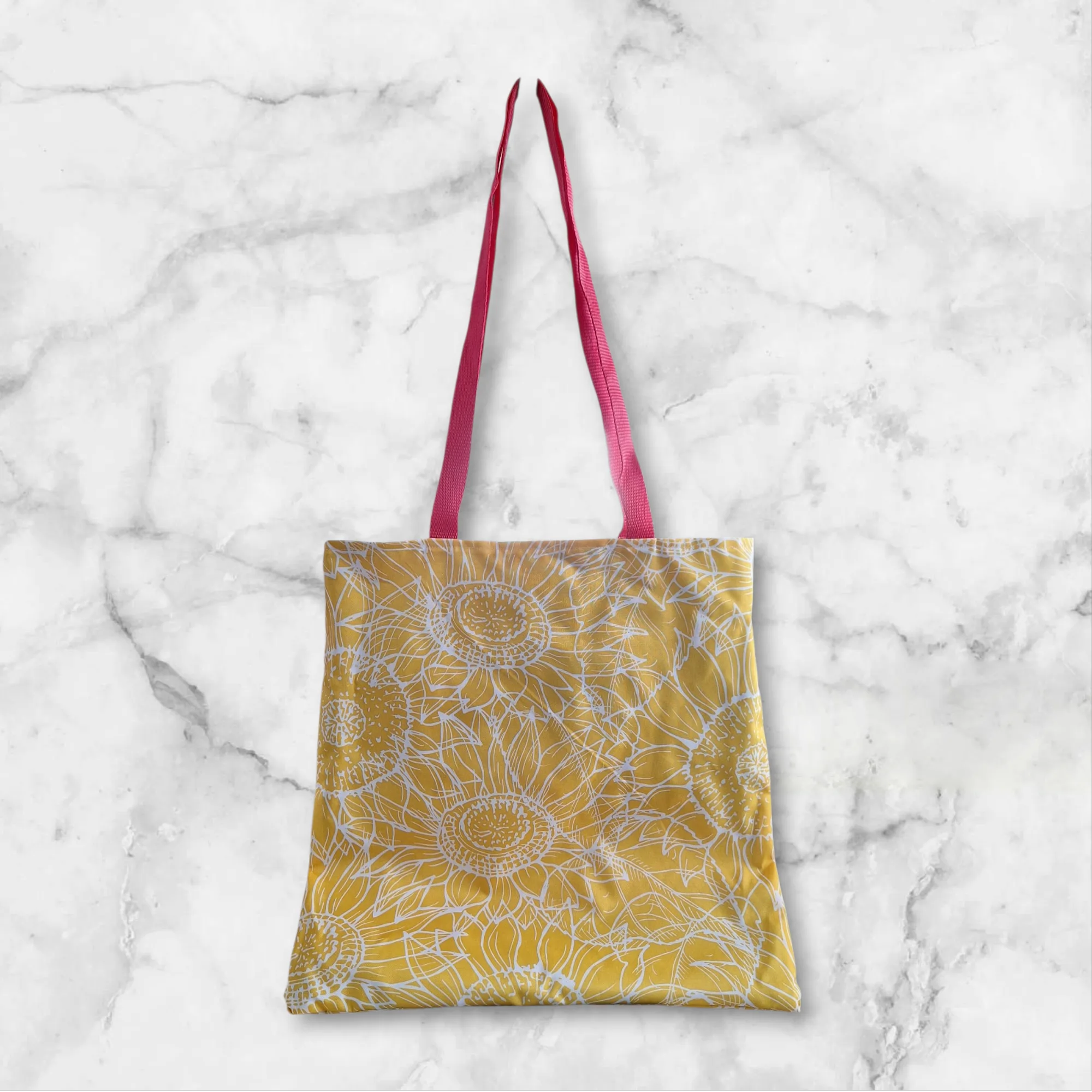 Tote bag artisanal réversible et imperméable, pratique et esthétique. Motifs été tropical ou fleuri jaune, pour changer de style selon vos envies.
